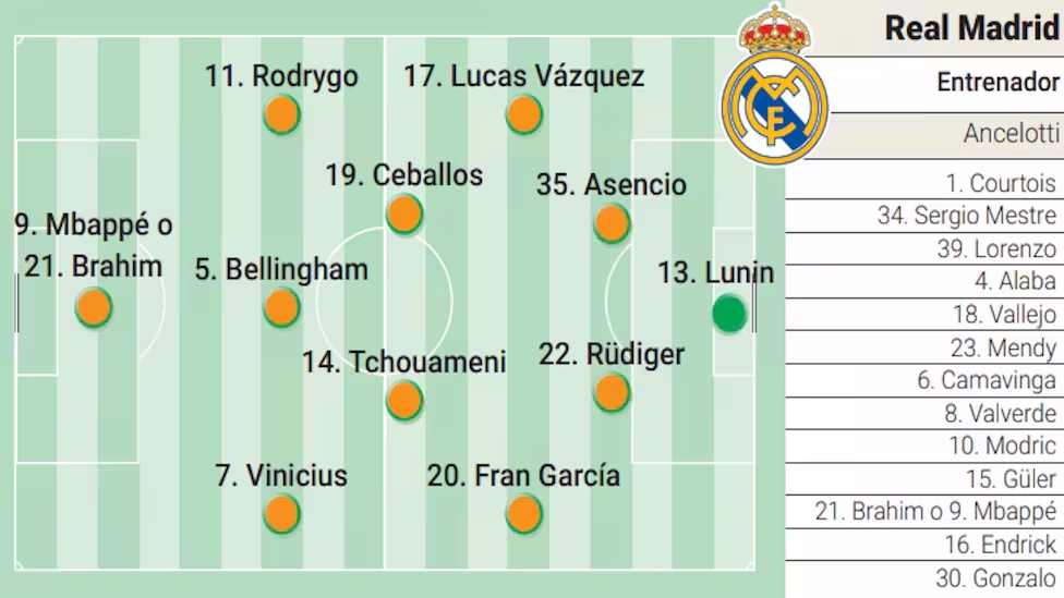 2月26日訊 明天凌晨國王杯半決賽首回合,皇馬客場對陣皇家社會?!栋⑺箞蟆奉A(yù)測了本場的皇馬首發(fā),盧寧在列,巴爾韋德或?qū)⒃俅潍@得輪休,鋒線上姆巴佩或?qū)?dān)任替補。門將:盧寧后衛(wèi):巴斯克斯、勞爾-阿森西奧、呂迪格、弗蘭-加西亞中場:瓊阿梅尼、塞巴略斯、貝林厄姆前鋒:羅德里戈、維尼修斯、姆巴佩/布拉欣-迪亞斯 本文標(biāo)簽: 足球 西甲 皇家馬德里