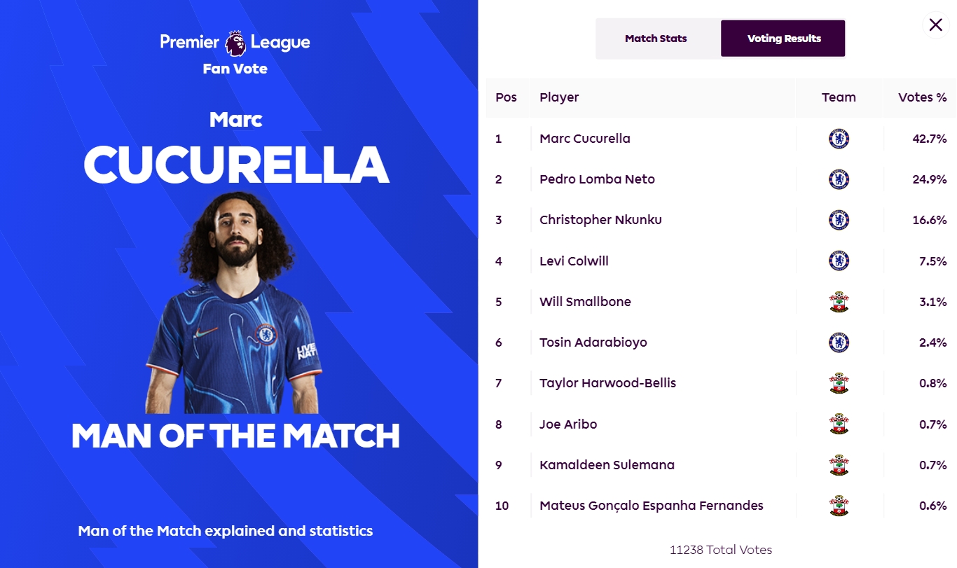 2月26日訊 本輪英超,切爾西主場4-0戰(zhàn)勝南安普頓。此役庫庫雷利亞發(fā)揮出色,以42.7%的得票率當(dāng)選全場最佳球員。此役庫庫雷利亞打進(jìn)一粒進(jìn)球,傳球成功率93.2%,9次對抗成功8次,6次成功搶斷。 本文標(biāo)簽: 足球 英超 切爾西