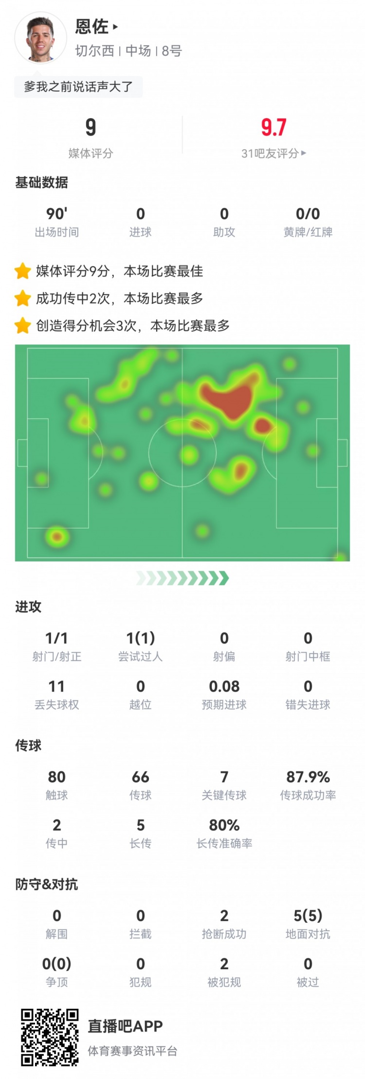 2月26日訊 本輪英超,切爾西4-0南安普頓。此役恩佐首發(fā)90分鐘被換下,球員全場重點數(shù)據(jù)如下↓1射1正1次過人11次丟失球權(quán)預(yù)期進球0.0880次觸球傳球成功率87.9%7次關(guān)鍵傳球5次長傳成功4次2次搶斷5次對抗全部成功評分9.0全場最高 本文標(biāo)簽: 足球 英超 切爾西 南安普頓