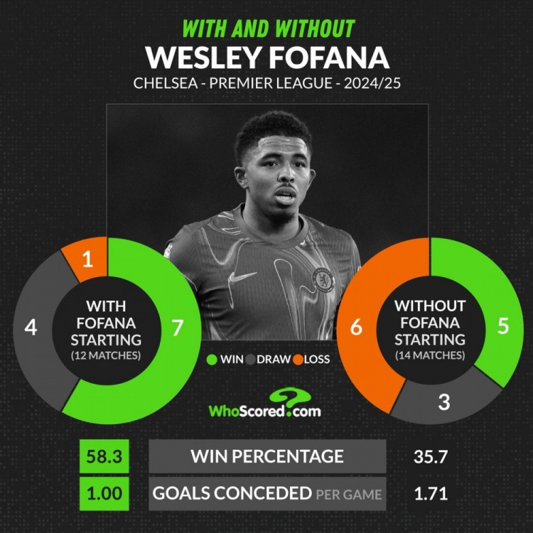 2月26日訊 切爾西在進(jìn)入2025年后的英超戰(zhàn)績(jī)斷崖式下滑,已經(jīng)跌至聯(lián)賽第7位。whoscored數(shù)據(jù)統(tǒng)計(jì)顯示,這可能與韋斯利-福法納的缺陣有關(guān):
