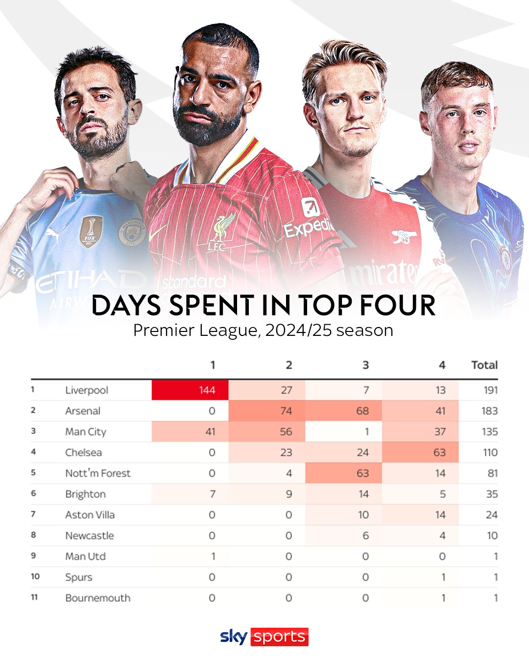 02月26日訊 天空體育統(tǒng)計(jì)了本賽季英超前四排名情況,利物浦排名榜首已有144天。