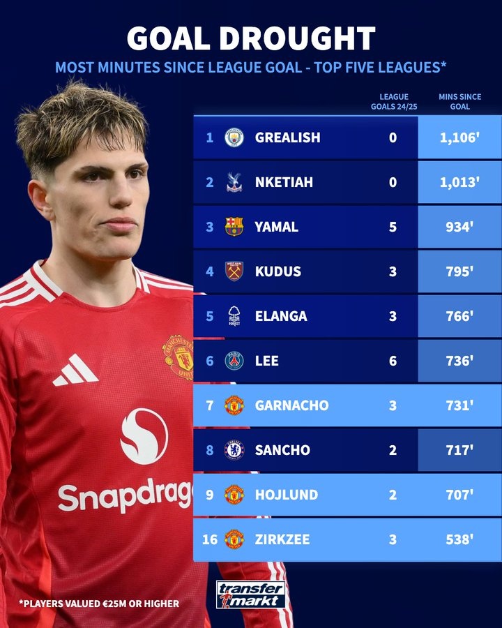 2月26日訊 德國轉(zhuǎn)會市場統(tǒng)計了目前五大聯(lián)賽的進(jìn)球荒時間排名,曼聯(lián)有2名球員進(jìn)入前十。