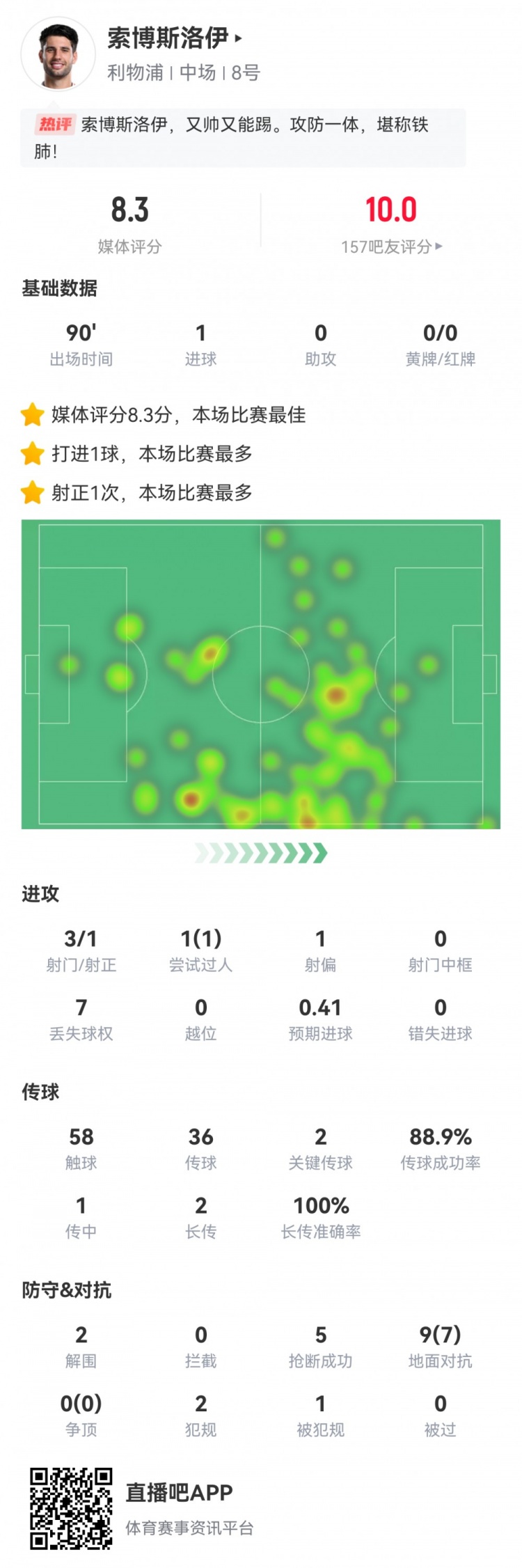 2月27日訊 本輪英超,利物浦2-0紐卡斯?fàn)?。此役索博斯洛伊首發(fā)打滿全場發(fā)揮出色,球員全場重點數(shù)據(jù)如下↓