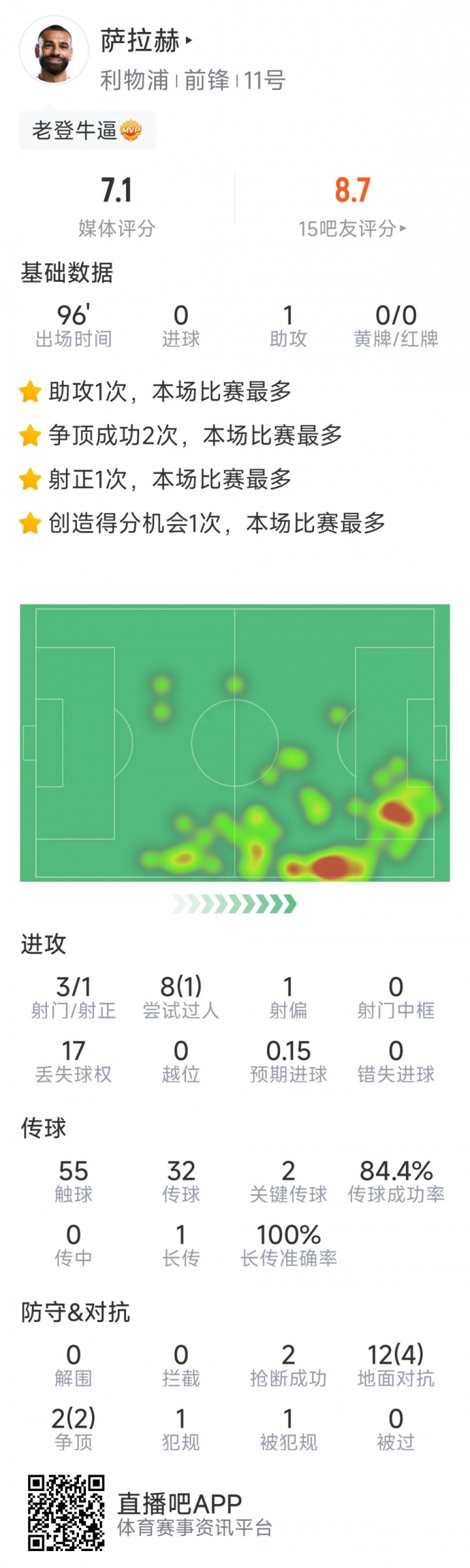 2月27日訊 在本輪英超,利物浦2-0擊敗紐卡,以下為薩拉赫本場(chǎng)數(shù)據(jù):比賽時(shí)間96分鐘1次助攻3射1正8次過人1次成功55次觸球2次關(guān)鍵傳球傳球成功率84.4%2次搶斷14次對(duì)抗6次成功評(píng)分7.1分 本文標(biāo)簽: 足球 英超 利物浦