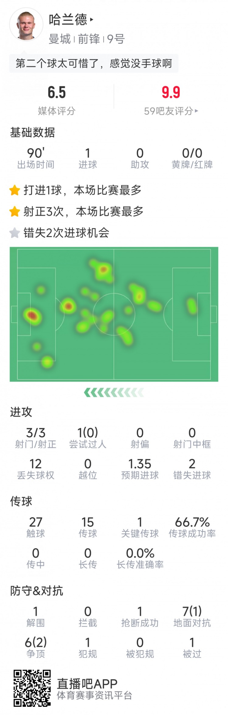 2月27日訊 在本輪英超,曼城1-0擊敗熱刺,哈蘭德破門。以下為他在本場數(shù)據(jù):比賽時間90分鐘1粒進球3次射門均射正2次錯失良機27次觸球1次關(guān)鍵傳球傳球成功率66.7%1次解圍1次搶斷13次對抗3次成功評分6.5分 本文標(biāo)簽: 足球 英超 曼城