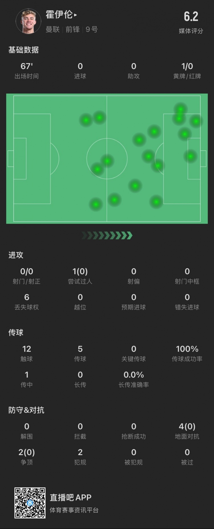 2月27日訊 英超第27輪,曼聯(lián)主場(chǎng)對(duì)陣伊普斯維奇的比賽正在進(jìn)行。第67分鐘,霍伊倫被換下場(chǎng)。本場(chǎng)比賽,他射門、關(guān)鍵傳球多項(xiàng)重要數(shù)據(jù)掛零,0對(duì)抗成功、0過人成功,獲評(píng)6.2分。