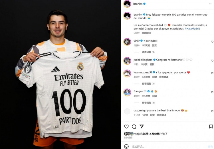 2月27日訊 在國王杯半決賽皇馬1-0擊敗皇家社會的比賽中,迪亞斯替補登場。這也是迪亞斯為皇馬各項賽事出戰(zhàn)的第100場比賽,賽后他也在個人社媒曬出與100場紀念球衣的合影,配文寫道:“很高興能為世界最佳俱樂部完成100次出場,一個夢想實現(xiàn)了。美好的瞬間永存,讓我們去爭取更多!感謝皇馬球迷的支持!” 本文標簽: 足球 西甲 皇家馬德里