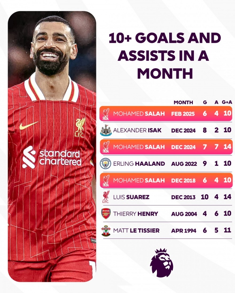 2月28日訊 英超官方盤點,薩拉赫是英超歷史上僅有的多次單月聯(lián)賽制造10+球的球員,而薩拉赫至今已經(jīng)有3次。