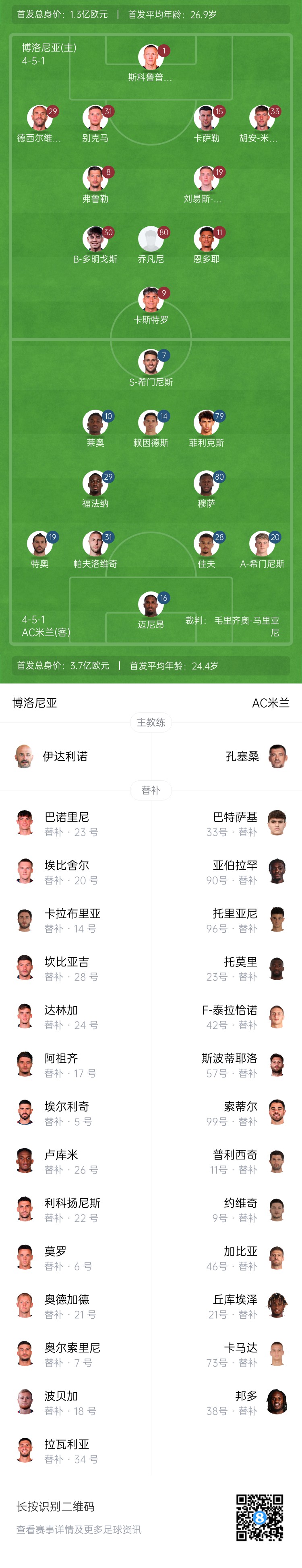 博洛尼亞替補(bǔ):23-巴諾里尼、34-拉瓦利亞、5-埃爾利奇、14-伊令、22-利科揚(yáng)尼斯、26-盧庫(kù)米、6-莫羅、17-阿祖齊、18-波貝加、20-埃比舍爾、7-奧爾索里尼、21-奧德加德、24-達(dá)林加、28-坎比亞吉