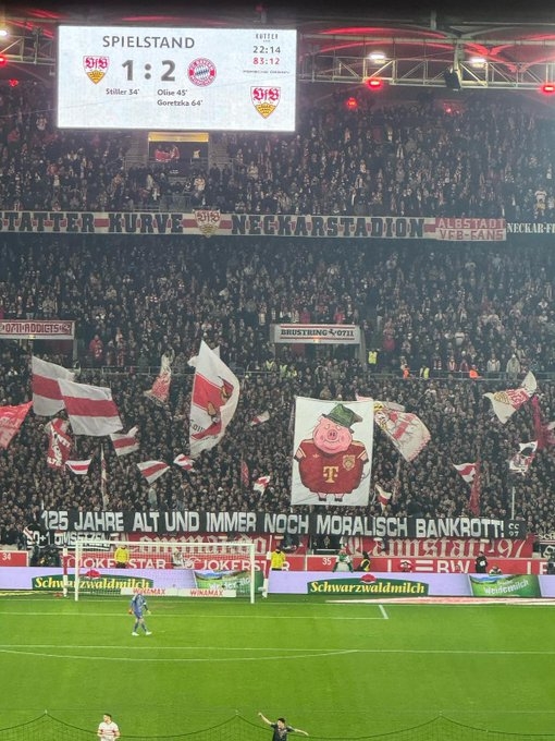 3月1日訊 今天凌晨,拜仁在德甲客場(chǎng)3-1擊敗斯圖加特,比賽期間,斯圖加特球迷展示橫幅嘲諷拜仁。拜仁最近慶祝了他們的成立125周年紀(jì)念,而斯圖加特球迷則打出橫幅嘲諷,橫幅上寫(xiě)道:“125歲了,道德依然淪喪?!?/p> 本文標(biāo)簽: 足球 德甲 拜仁慕尼黑 斯圖加特