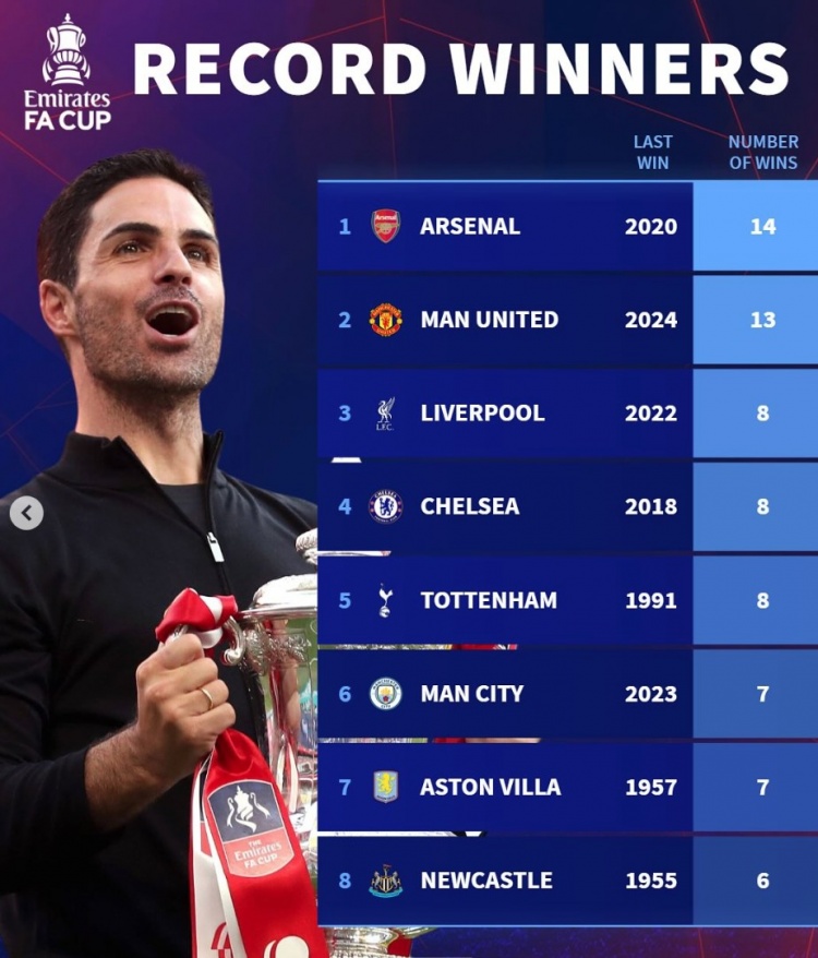 3月1日訊 本賽季足總杯才進行到16強戰(zhàn)環(huán)節(jié),但BIG6球隊僅剩曼市雙雄仍未被淘汰。數(shù)據(jù)統(tǒng)計顯示,曼聯(lián)有望在今年追平阿森納的歷史奪冠紀錄。