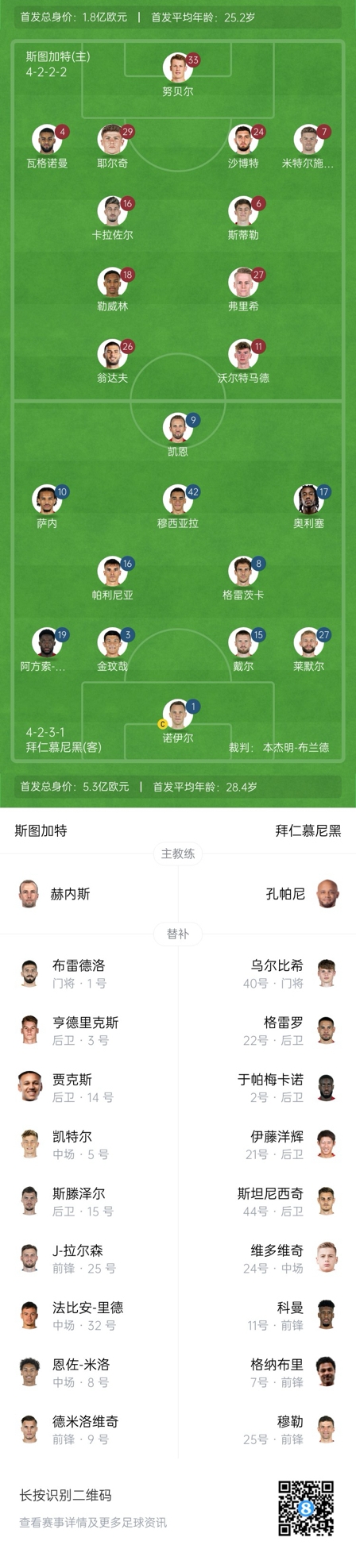 拜仁替補:40-烏爾比格、2-于帕梅卡諾、21-伊藤洋輝、22-格雷羅、44-斯坦尼西奇、24-維多維奇、7-格納布里、11-科曼、25-穆勒