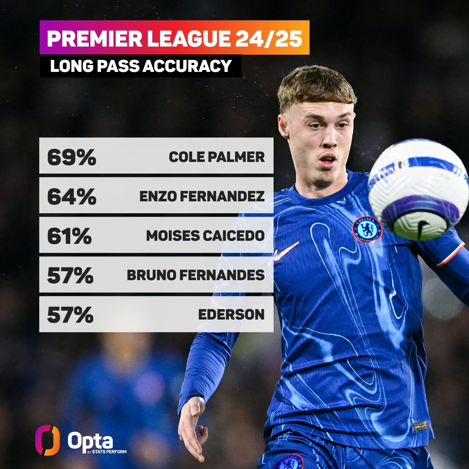 3月1日訊 根據(jù)OPTA統(tǒng)計(jì),帕爾默是本賽季英超長(zhǎng)傳成功率最高的球員。