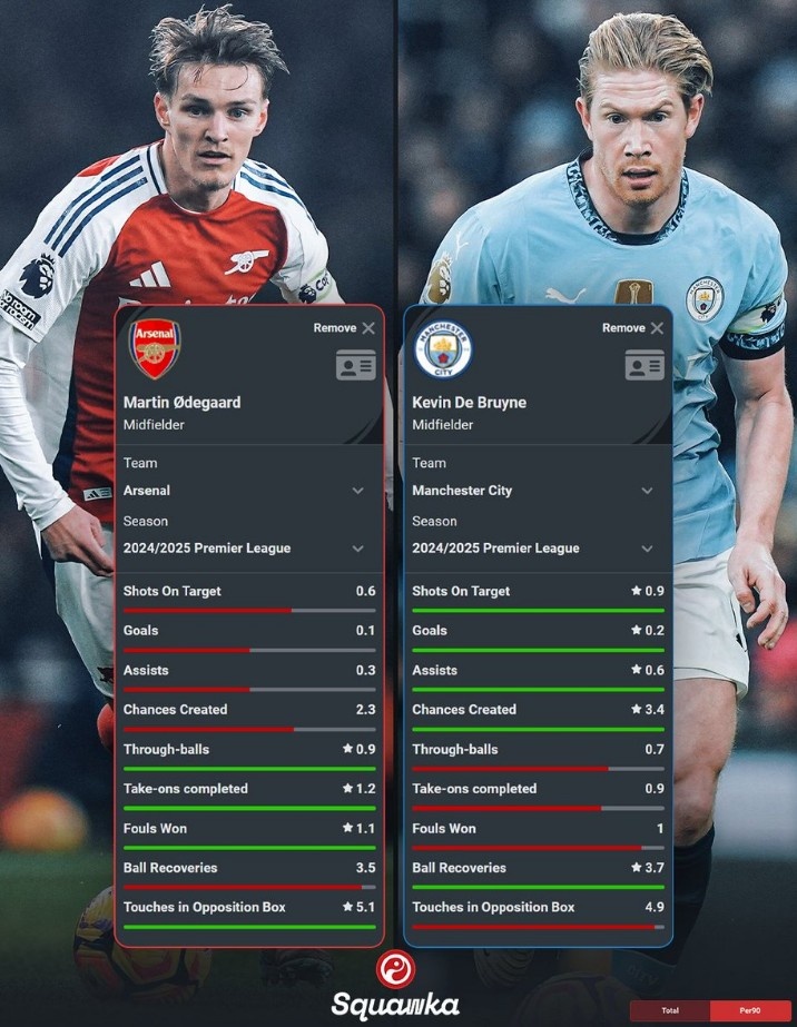 1月31日訊 本周末英超將迎來阿森納與曼城的焦點(diǎn)戰(zhàn),數(shù)據(jù)網(wǎng)站Squawka也盤點(diǎn)了兩隊(duì)中場(chǎng)指揮官厄德高、德布勞內(nèi)本賽季在英超每90分鐘數(shù)據(jù)對(duì)比,具體如下: