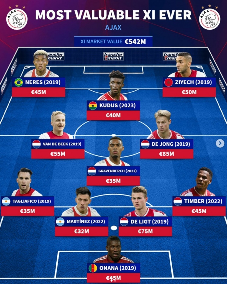 1月31日訊 德轉(zhuǎn)盤點了阿賈克斯隊史身價最高11人陣容,其中曼聯(lián)隊內(nèi)防線三將奧納納、利桑德羅、德里赫特在列,以下為具體陣容(身價為效力阿賈克斯時最高身價):