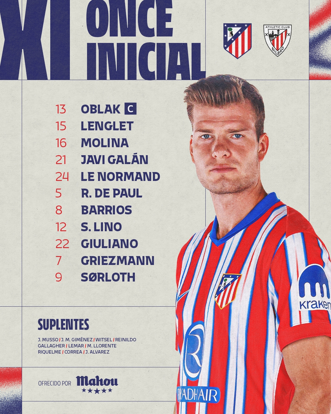 馬競首發(fā):13-奧布拉克、15-朗格萊、16-莫利納、21-加蘭、24-勒諾爾芒、5-德保羅、8-巴勃羅-巴里奧斯、12-利諾、22朱利亞諾-西蒙尼、7-格列茲曼、9-索爾洛特
