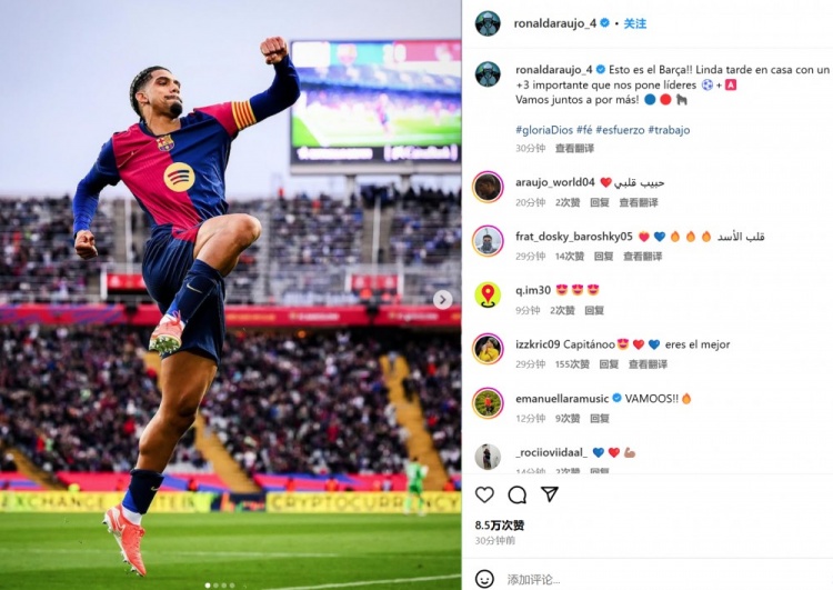 3月3日訊 巴薩在本輪西甲4-0完勝皇社,中衛(wèi)阿勞霍傳射建功。第55分鐘,拉菲尼亞角球開出,萊萬前點頭球攻門被門將撲出,阿勞霍頭球補射得手。第59分鐘,阿勞霍前場起腳遠射,萊萬在禁區(qū)中路順勢蹭了一腳讓皮球折射入網(wǎng)。阿勞霍也在賽后通過社媒曬出自己的慶祝照,并配文:“這就是巴薩!在主場度過了一個美好的下午!贏下關(guān)鍵三分,并傳射建功!讓我們團結(jié)一致贏得更多!” 本文標簽: 足球 西甲 巴塞羅那 皇家社會