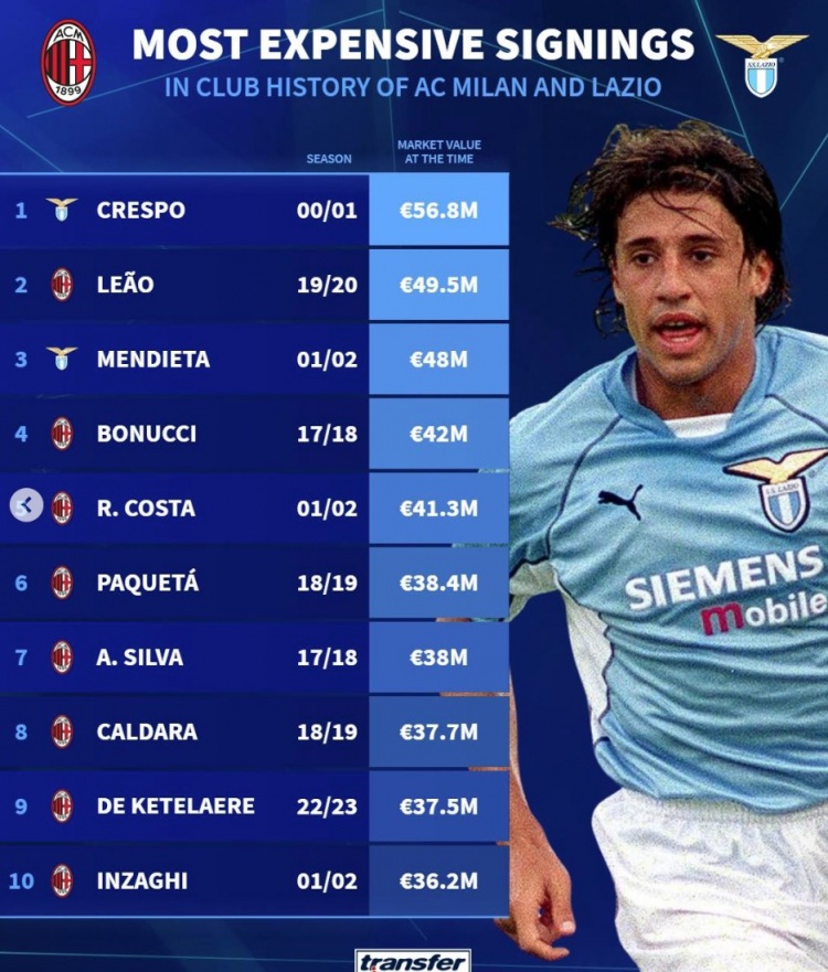 德轉列米蘭&拉齊奧歷史轉會費最貴榜:歐元