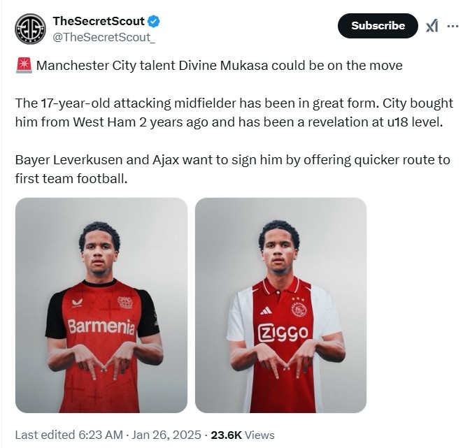 1月26日訊 英媒TheSecretScout消息,勒沃庫(kù)森和阿賈克斯希望簽下曼城17歲進(jìn)攻型中場(chǎng)穆卡薩。2023年9月,曼城從西漢姆青訓(xùn)簽下了穆卡薩,目前他效力曼城U18。本賽季穆卡薩在U18英超梯隊(duì)聯(lián)賽中,12次出場(chǎng)貢獻(xiàn)12球12次助攻。 本文標(biāo)簽: 足球 英超 曼城 德甲 勒沃庫(kù)森 荷甲