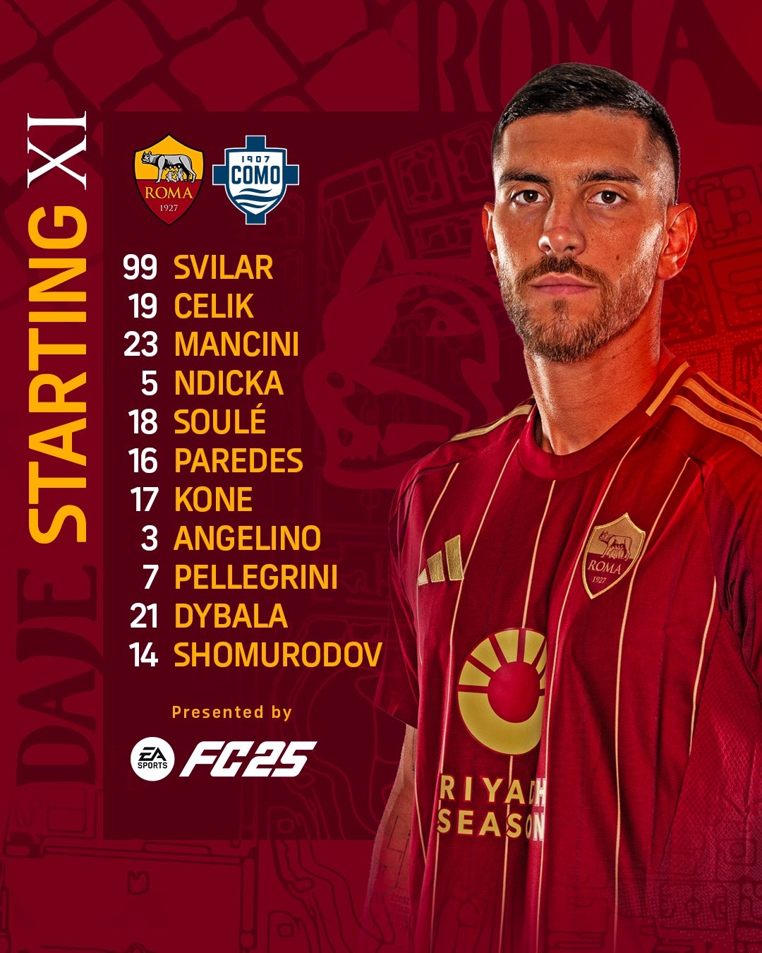 3月3日訊 意甲第27輪比賽,羅馬在主場(chǎng)迎戰(zhàn)科莫。目前,羅馬首發(fā)已經(jīng)出爐,迪巴拉領(lǐng)銜,帕雷德斯、蘇萊出戰(zhàn)。以下為具體首發(fā)陣容:99-斯維拉爾、19-切利克、23-曼奇尼、5-恩迪卡、18-蘇萊、16-帕雷德斯、17-科內(nèi)、3-安吉利諾、21-迪巴拉、14-肖穆羅多夫 本文標(biāo)簽: 足球 意甲 羅馬 科莫