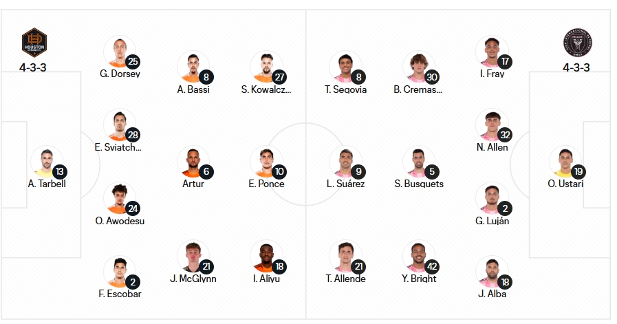 邁阿密?chē)?guó)際首發(fā):19-烏斯塔里、17-伊恩-弗雷、32-阿倫、2-盧揚(yáng)、18-阿爾巴、5-布斯克茨、30-克雷馬斯基、42-楊尼克-布萊特、8-特拉斯科、21-阿連德、9-蘇亞雷斯