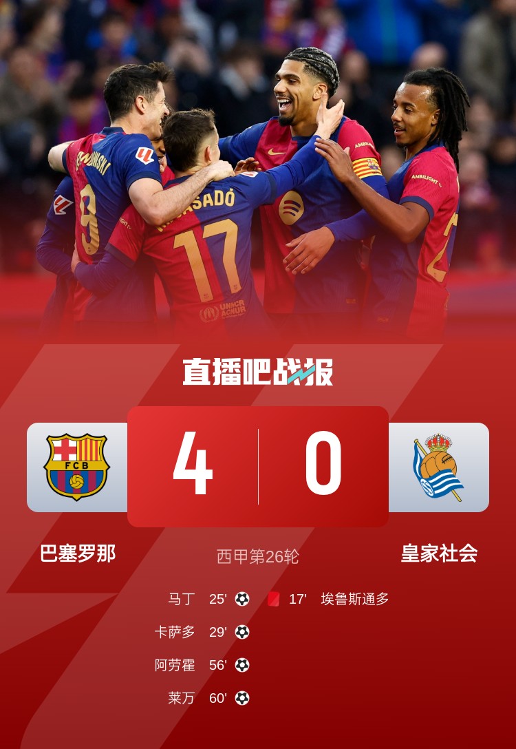西甲第26輪,巴薩4-0橫掃十人皇家社會,阿勞霍傳射,萊萬進球。