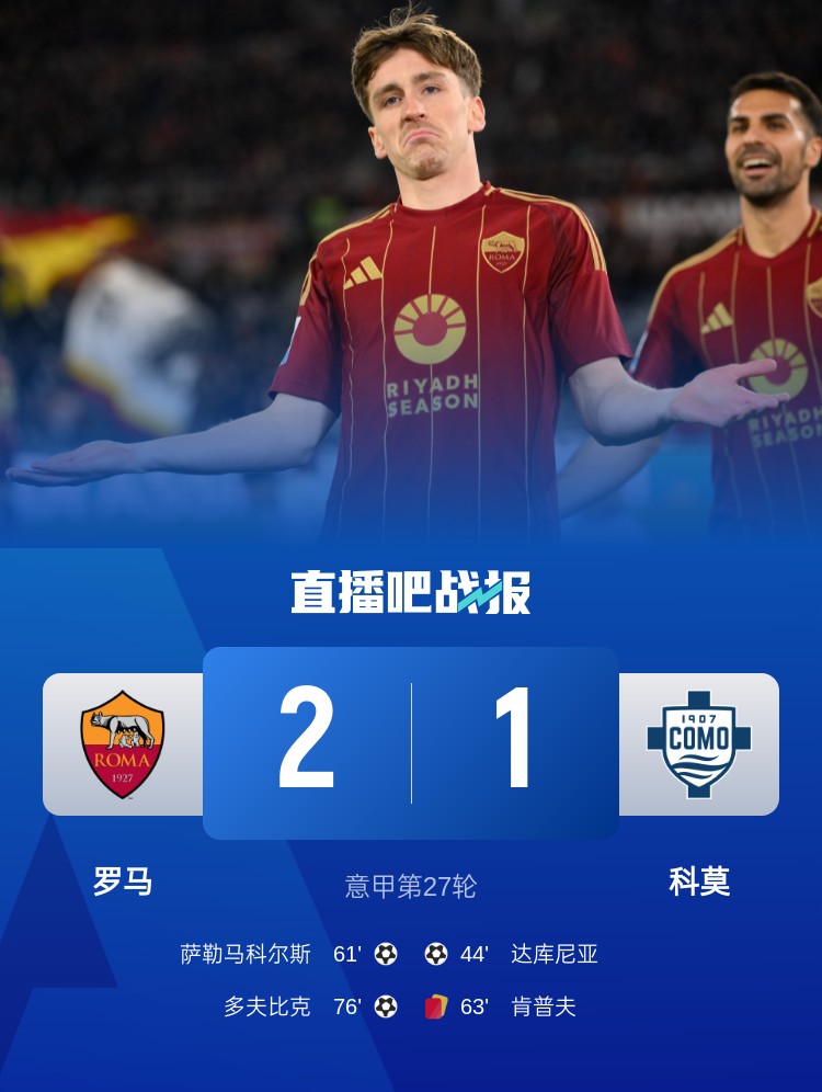 意甲第27輪,羅馬2-1逆轉科曼,薩勒馬科爾斯、多夫比克進球。