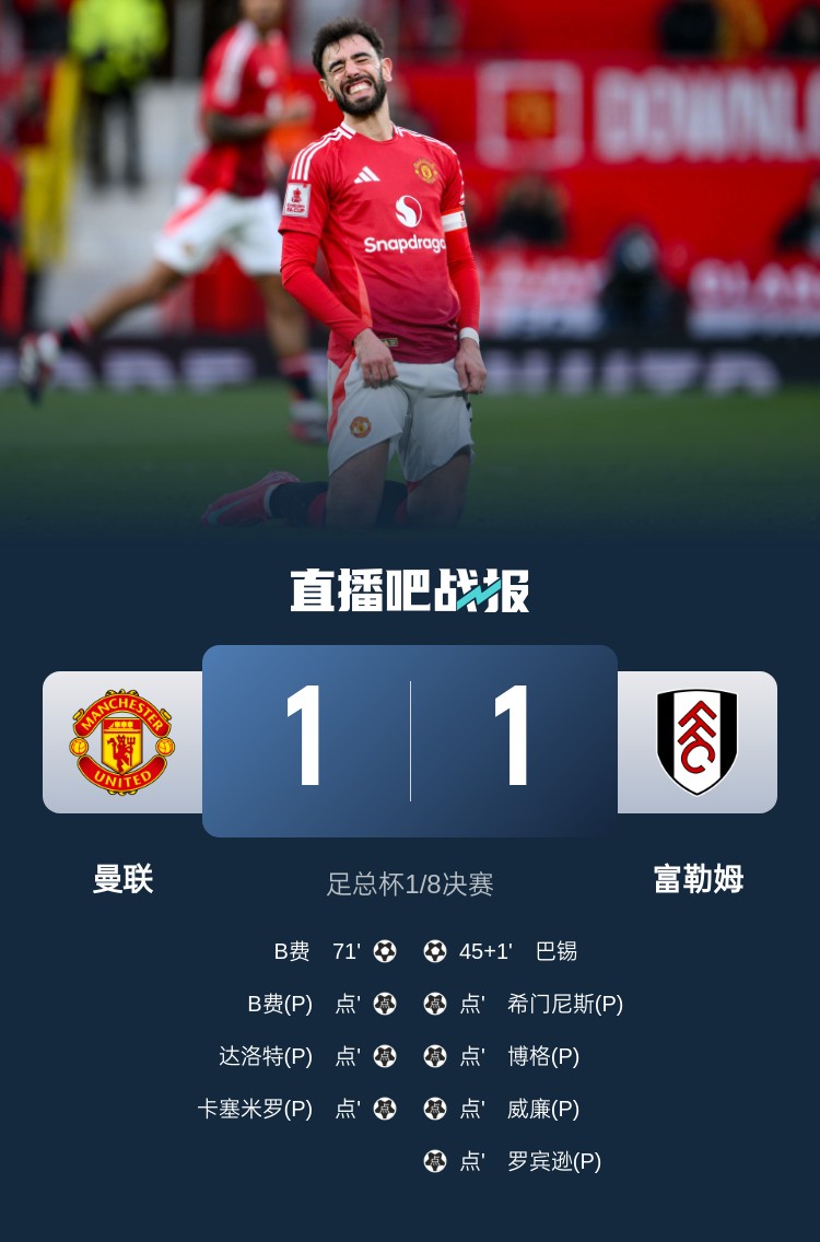 足總杯1/8決賽,曼聯(lián)1-1,點球大戰(zhàn)3-4不敵富勒姆,止步16強,林德洛夫、齊爾克澤失點。