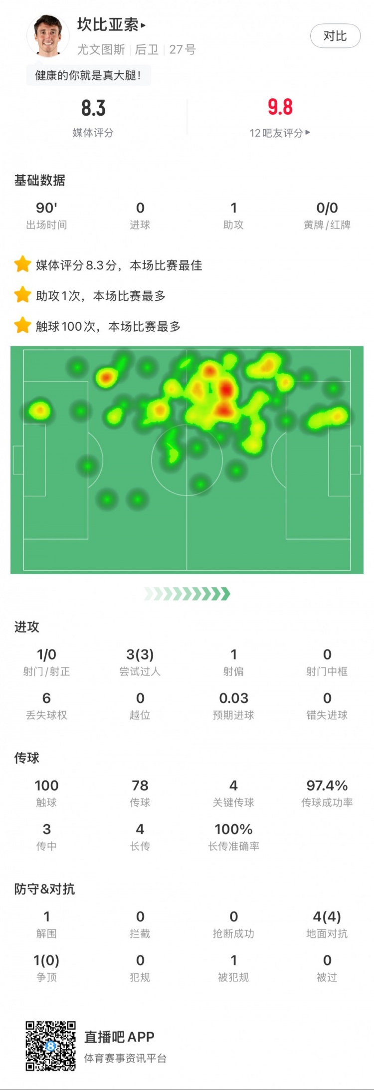 3月4日訊 意甲第27輪,尤文2-0維羅納??脖葋喫鞅緢鰯?shù)據(jù):1次助攻1次解圍100次觸球78次傳球76次成功傳球成功率97%4次關(guān)鍵傳球3次傳中1次成功4次長傳4次成功6次丟失球權(quán)1次被犯規(guī)1次射門3次過人3次成功獲評8.3分全場最高 本文標簽: 足球 意甲 尤文圖斯