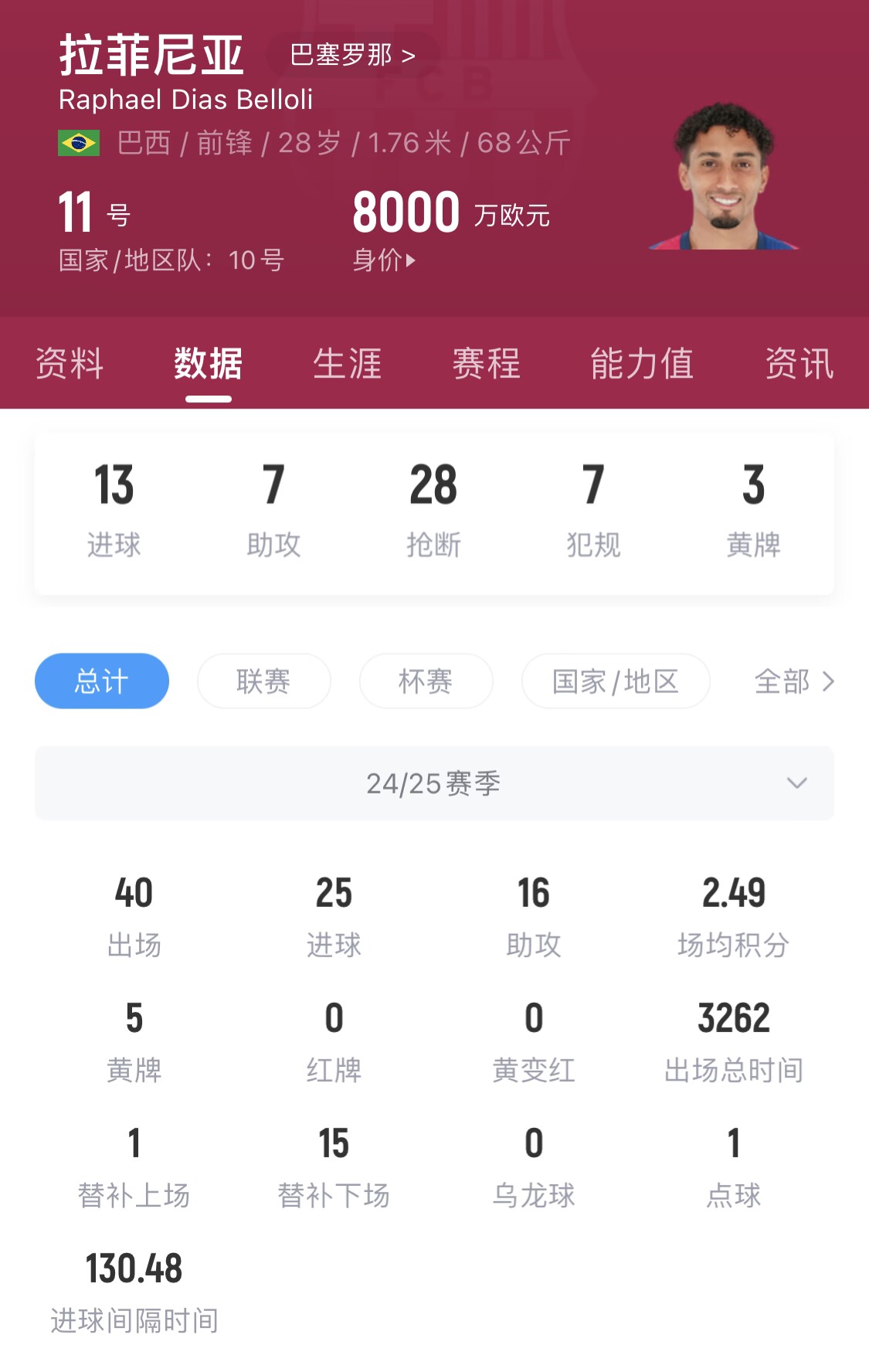 28歲的巴西前鋒目前身價(jià)8000萬(wàn)歐,本賽季至今40場(chǎng)比賽25球16助。