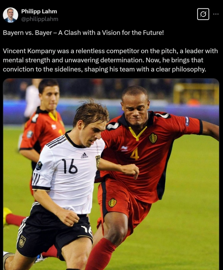 拉姆寫道:拜仁對(duì)陣?yán)瘴謳?kù)森,這是一場(chǎng)未來愿景之間的較量!在球場(chǎng)上,孔帕尼是一位不屈不撓的斗士,一位擁有強(qiáng)大精神力量和堅(jiān)定決心的領(lǐng)袖?,F(xiàn)在,他將這種信念帶到了教練席,正在用清晰的理念塑造他的球隊(duì)。