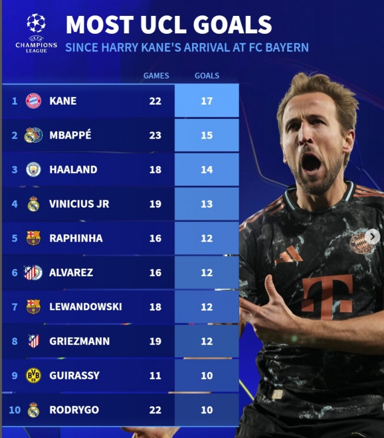 3月6日訊 拜仁在本輪歐冠3-0完勝勒沃庫森,凱恩頭頂腳踢梅開二度,延續(xù)了加盟拜仁后的出色狀態(tài)。數(shù)據(jù)統(tǒng)計顯示,自凱恩加盟拜仁后,他的同期進球領跑歐冠。