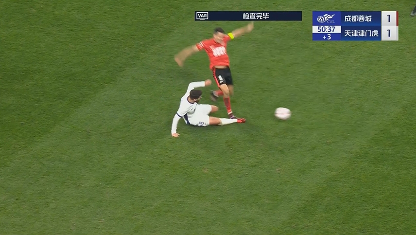 中超聯(lián)賽第2輪,成都蓉城VS天津津門虎,比賽第45+3分鐘,成都蓉城8號隊員在爭搶球時疑似踩踏天津津門虎8號隊員,裁判員未判罰犯規(guī),VAR介入,裁判員經(jīng)在場回看后,判罰成都蓉城8號隊員嚴(yán)重犯規(guī),并向其出示紅牌罰令出場。