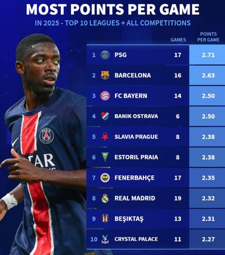 2025年各項(xiàng)賽事場均拿分榜:巴黎巴薩拜仁前三,皇馬費(fèi)內(nèi)巴切在列