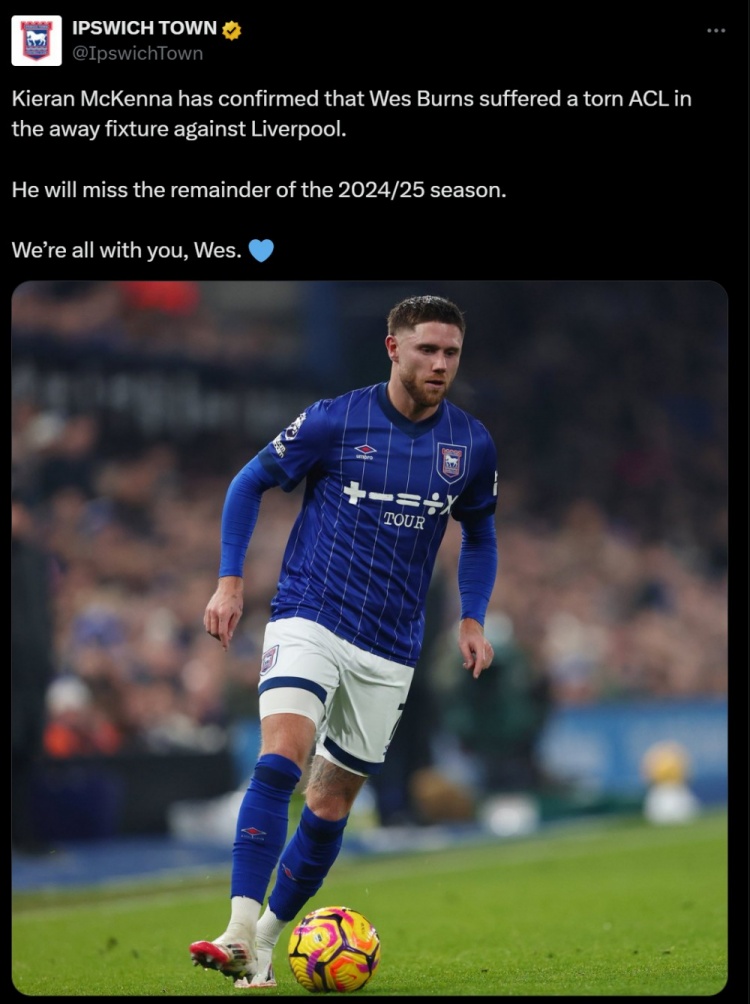 伊普斯維奇表示,伯恩斯在客戰(zhàn)利物浦的比賽中十字韌帶撕裂,他將缺席本賽季剩余的所有比賽。