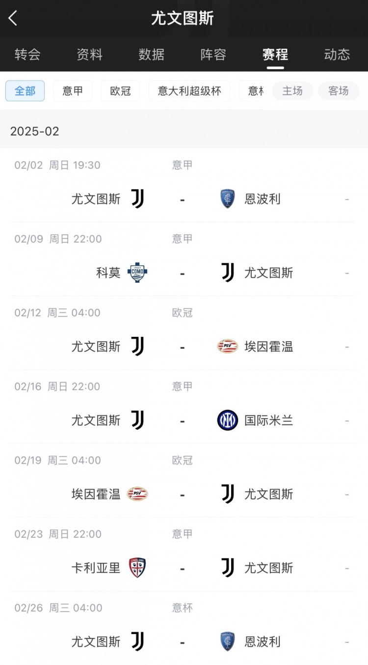 尤文將在北京時(shí)間2月12日4:00主場(chǎng)對(duì)陣埃因霍溫,2月16日22:00主場(chǎng)迎來與國米的意大利國家德比,2月19日4:00赴客場(chǎng)與埃因霍溫展開次回合較量。