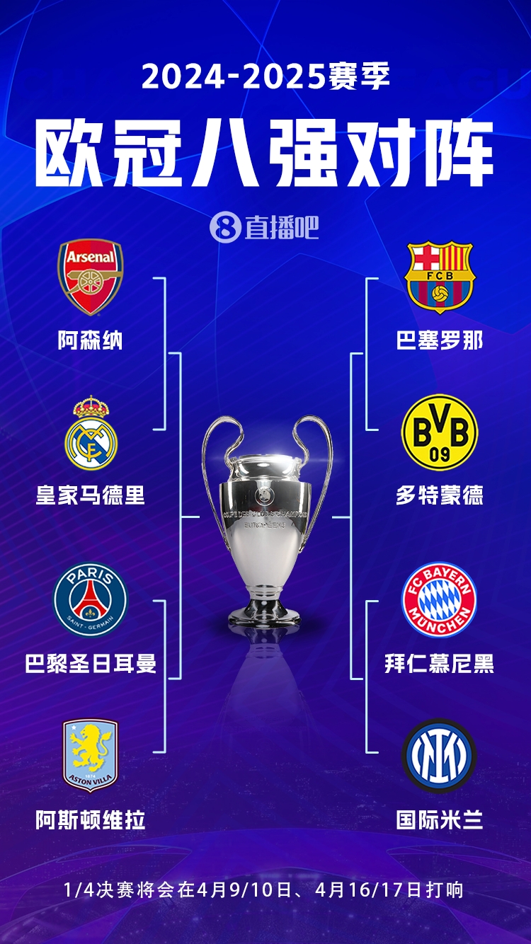 歐冠8強(qiáng):拜仁、國(guó)米、巴薩、多特、巴黎、維拉、阿森納、皇馬