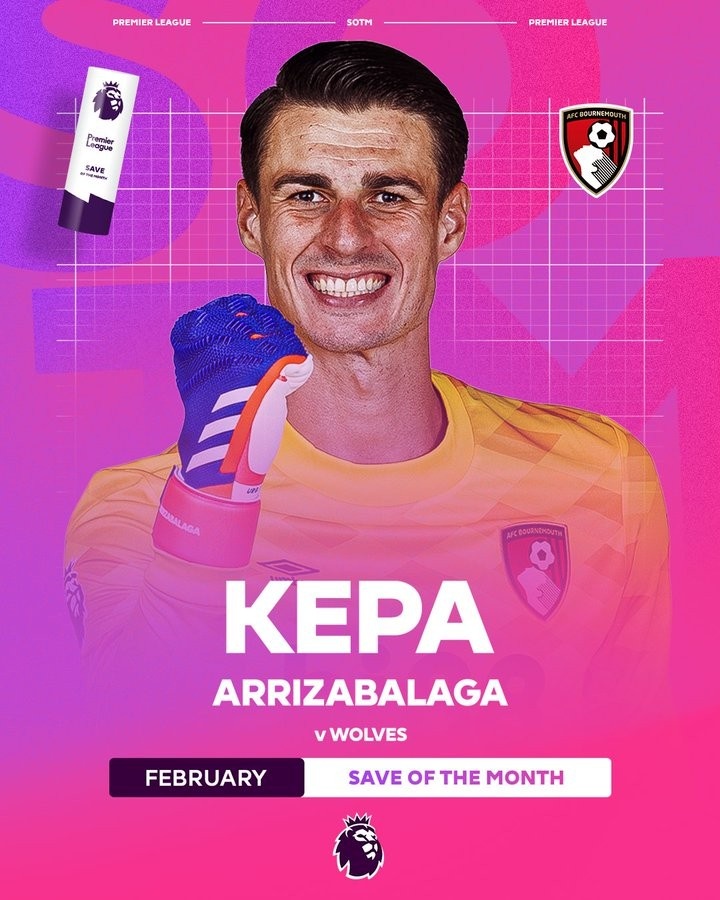 3月14日訊 英超官方宣布,切爾西外租到伯恩茅斯的門將凱帕,在對陣?yán)顷爼r的兩連撲當(dāng)選為英超2月最佳撲救。