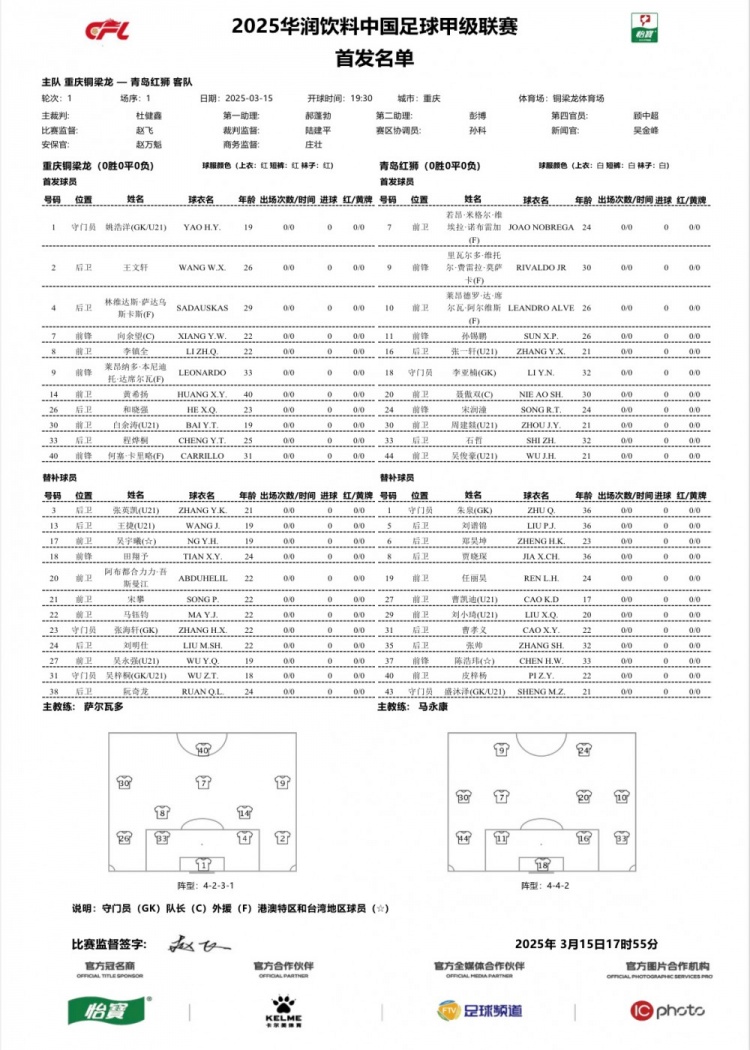 3月15日訊 中甲首輪比賽,重慶銅梁龍主場(chǎng)迎戰(zhàn)青島紅獅,目前雙方首發(fā)名單已經(jīng)公布。