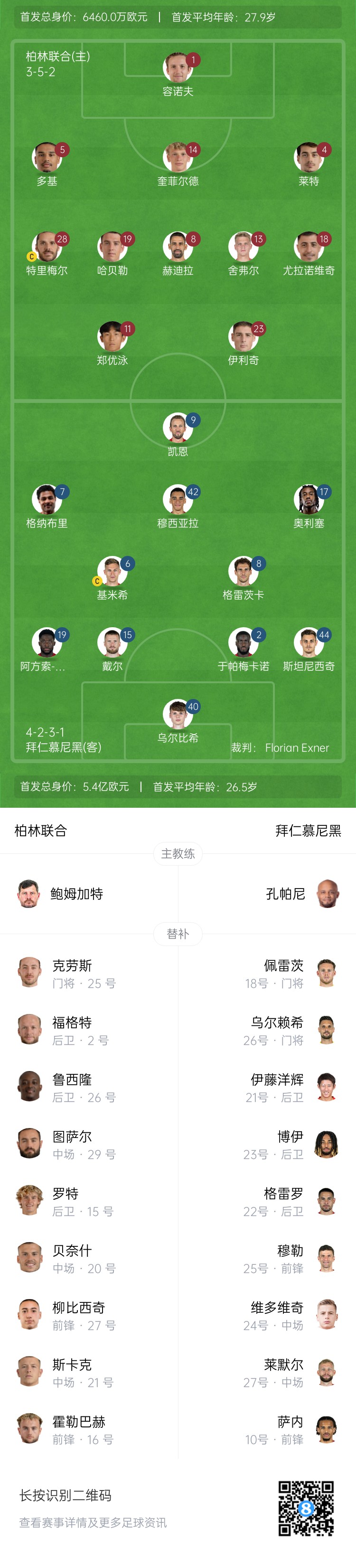 柏林聯(lián)合首發(fā):1-容諾夫、4-萊特、5-多基、14-奎菲爾德、18-尤拉諾維奇、8-拉尼-赫迪拉、13-舍費(fèi)爾、11-鄭優(yōu)泳、19-哈貝勒、28-特里梅爾、23-伊利奇