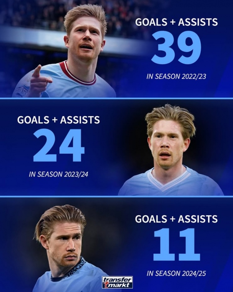 3月16日訊 曼城在本輪英超2-2戰(zhàn)平布萊頓,德布勞內(nèi)最后時刻替補(bǔ)登場,《轉(zhuǎn)會市場》統(tǒng)計顯示他的關(guān)鍵數(shù)據(jù)近年持續(xù)下滑: