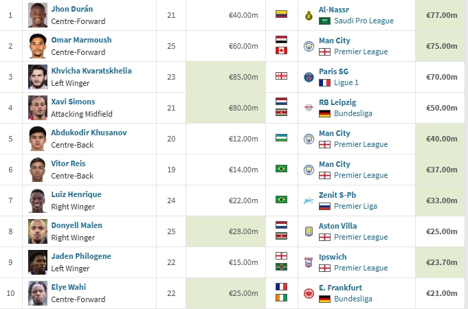 02月01日訊 利雅得勝利官宣簽下杜蘭,杜蘭也以7700萬歐暫時(shí)成為今年冬窗標(biāo)王,前十曼城有3人入選。