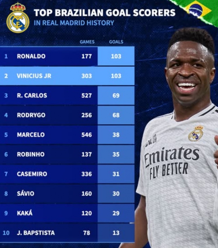 3月16日訊 《轉(zhuǎn)會市場》統(tǒng)計了皇馬歷史巴西球員進球榜,大羅和維尼修斯均打進103球并列最多。
