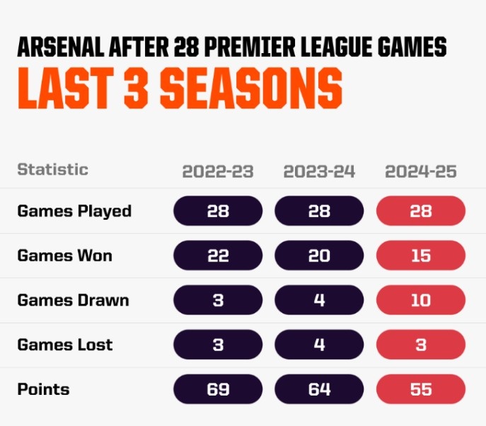 數(shù)據(jù)網(wǎng)站OPTA也盤(pán)點(diǎn)了阿森納近三個(gè)賽季28輪過(guò)后積分情況對(duì)比,具體如下:
