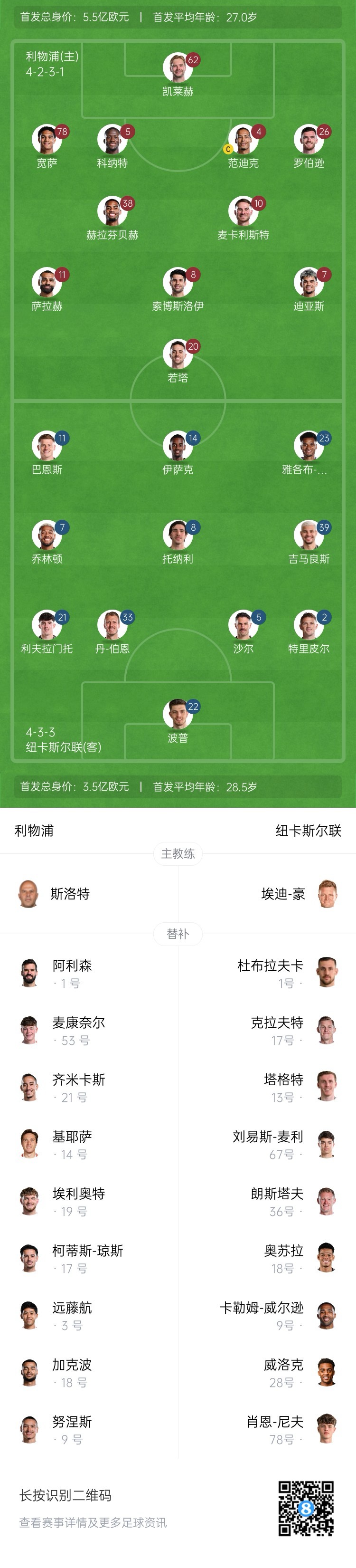 利物浦首發(fā):62-凱萊赫、78-寬薩、5-科納特、4-范迪克、26-羅伯遜、38-赫拉芬貝赫、8-索博斯洛伊、10-麥卡利斯特、11-薩拉赫、7-迪亞斯、20-若塔