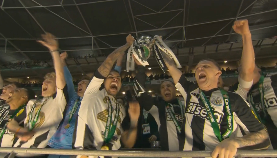 03月17日訊 紐卡擊敗利物浦奪得聯(lián)賽杯獎杯,終結(jié)隊史70年國內(nèi)頂級賽事冠軍荒。賽后頒獎儀式,特里皮爾和吉馬良斯捧起冠軍獎杯!