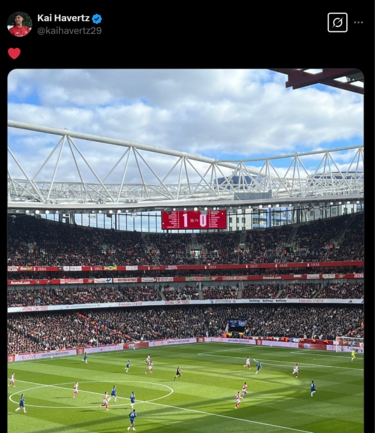 3月17日訊 本輪英超焦點戰(zhàn)中,阿森納1-0小勝切爾西。本場比賽,有傷在身的哈弗茨和薩卡來到主場為槍手加油助威。賽后,哈弗茨曬出了比分牌,慶祝阿森納擊敗自己的老東家切爾西,并配文:?。上個月阿森納在迪拜集訓(xùn)期間,哈弗茨不幸在訓(xùn)練中受傷,賽季提前報銷。 本文標簽: 足球 英超 切爾西 阿森納