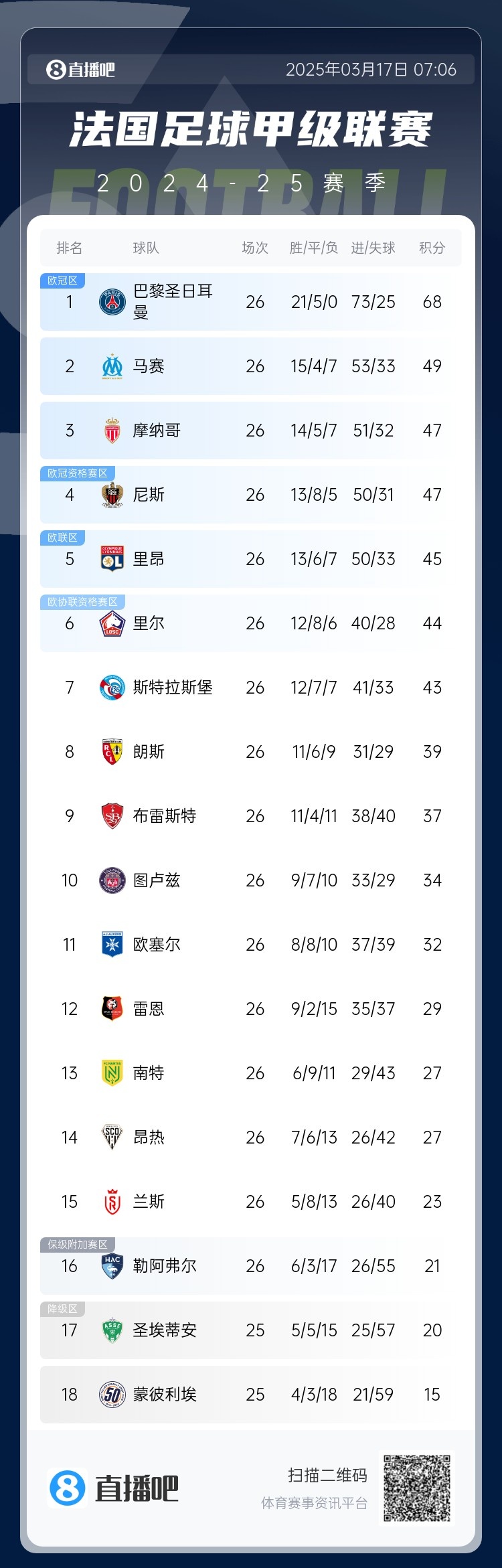 3月17日訊 在本輪法甲前兩名的直接對話中,巴黎3-1擊敗馬賽。在法甲26輪過后巴黎領(lǐng)先次席馬賽的優(yōu)勢已經(jīng)達到19分,在聯(lián)賽還剩8輪的情況下,如果下一輪比賽巴黎獲勝,而馬賽輸球,摩納哥與尼斯戰(zhàn)平的話,巴黎即可提前奪得冠軍。 本文標簽: 足球 法甲 巴黎圣日耳曼