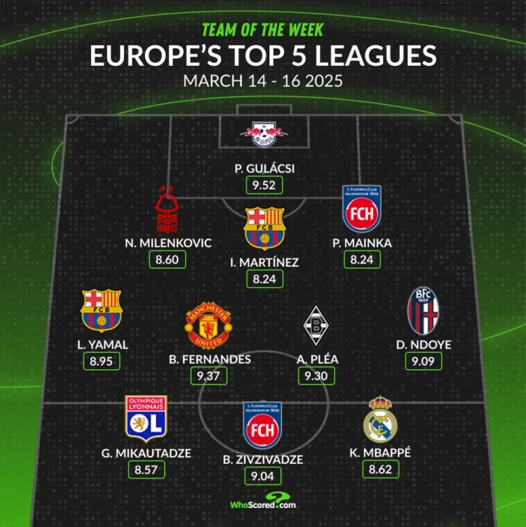 中場:亞馬爾(巴薩,8.95分)、B費(曼聯(lián),9.37分)、普萊亞(門興,9.30分)、恩多耶(博洛尼亞,9.09分)
