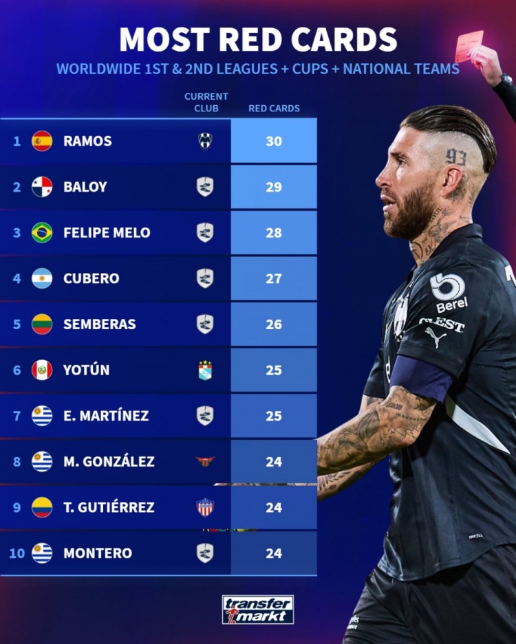 3月18日訊 墨西哥聯(lián)賽第12輪比賽,拉莫斯為蒙特雷首發(fā)出戰(zhàn),第92分鐘染紅離場,最終蒙特雷客場3-1擊敗墨西哥美洲獅。德國轉(zhuǎn)會市場統(tǒng)計了球員吃到紅牌的數(shù)量,拉莫斯以30張紅牌居首。
